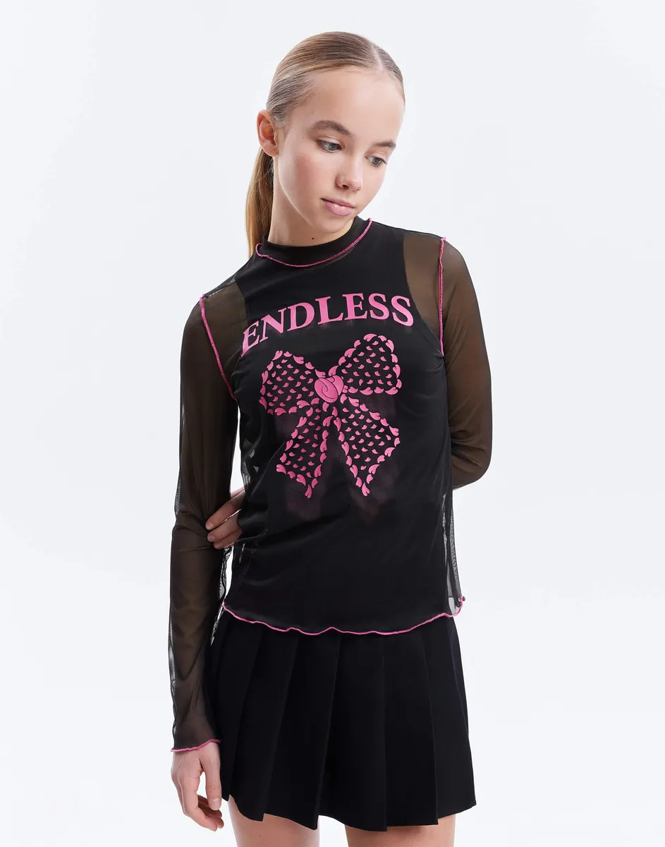 Чёрный сетчатый лонгслив с принтом и контрастными швами GKT025445-2